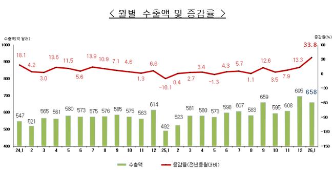 경제 1월 수출 658억달러 ‘역대 최대’…8개월 연속 증가 2026년 1월 수출이 658억 달러로 역대 1월 기준 최대치를 기록했다.관세청이 발표한 2026년 1월 수출입 확정치에 따르면, 수출은 전년 동월 대비 33.8% 증가한 658억 달러, 수입은 11.6% 늘어난 571억 달러로 집계됐다. 무역수지는 87억 달러 흑자를 기록하며 12개월 연속 흑자를 이어갔다.1월 수출은 반도체와 승용차 등 주력 품목의 호조에 힘입어 8개...